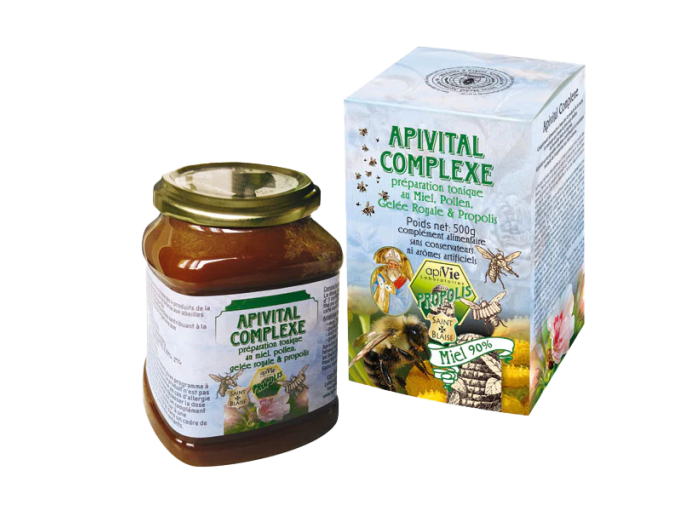 Apivital Complexe est une préparation tonique à base de miel, pollen lactofermenté, gelée royale et propolis. Ce produit est la quasi reconstitution du pain d'abeille, la nourriture des abeilles, qui leur donne cette incroyable faculté à travailler et butiner à longueur de journée. Reconnu pour ses vertus immunostimulantes, Apivital complexeoffre un véritable concentré de vitalité et d'endurance. Ce mélange reconstitue la richesse nutritive du panier apicole, apportant force et énergie au quotidien.