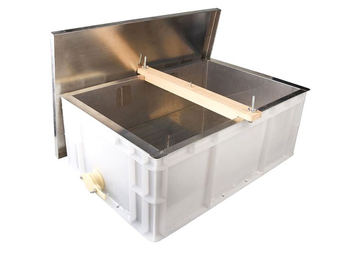 Le couvercle inox est conçu pour utiliser le bac comme décanteur à miel. Les opercules s'égouttent tranquillement au travers du bac inox et le miel tombe dans le bac plastique. Il peut ensuite être récupéré grâce au robinet à clapet inclus