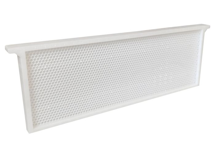 Surface augmentée de 9% par rapport à un cadre bois, on gagne la surface d'un cadre par hausse. Cellules pré-étirées sur une hauteur de 6 mm, ce qui donne une gaufre de 12 mm, incassable à l’extraction.