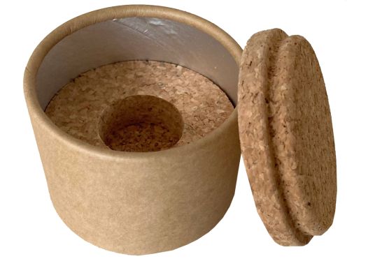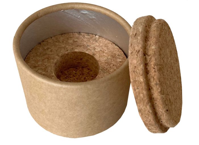 Boite avec couvercle et intérieur en liège contenant un emballage carton isotherme, idéale pour le transport et le conditionnement de votre gelée royale !
