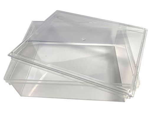 Les boites emboîtables sont réalisées en matière plastique alimentaire recyclable, souple transparente. Les couvercles emboîtables sont réalisés en matière plastique alimentaire recyclable, qualité Cristal.