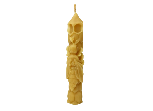 Cette bougie toute en longueur, représentant une reine des abeilles, est fabriquée à la cire d’abeille.