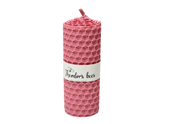 Essentiellement composée de cire d’abeille, cette bougie de décoration, couleur rose et de forme cylindrique, contient de petites alvéoles rappelant les éléments de la ruche.