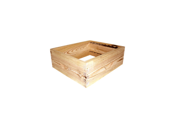 Hausse pour ruche Langstroth/Dadant, déclinée dans sa version en pin maritime et équipée de bandes lisses pour cadres Hoffmann.