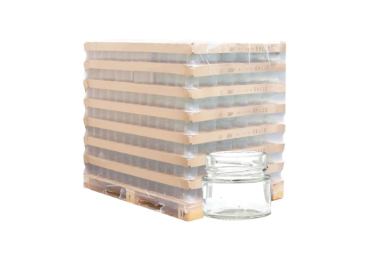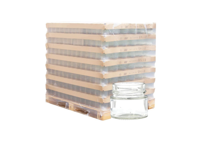 Palette de 6137 pots en verre 106 ml, modèle Jupe Haute, compatible avec capsules TO58. Ce format compact au design élancé est idéal pour le conditionnement de petites quantités de miel, sauces ou échantillons. Sa forme verticale offre une grande surface d’étiquetage et une présentation professionnelle.