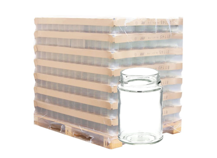Palette de 2418 pots en verre 212 ml, modèle Jupe Extra Haute, compatible avec capsules TO70. Son format vertical maximise la surface d’étiquetage tout en offrant une présentation élégante et professionnelle. Parfait pour une utilisation artisanale ou professionnel.