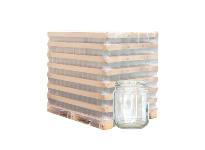 Palette de pots en verre 228 ml avec bague protégée TO63. Ce modèle est conçu pour le conditionnement de miels, fruits au sirop ou autres préparations alimentaires. La bague protégée offre une meilleure sécurité lors du capsulage et une finition plus propre. La palette de 3179 pots en verre.