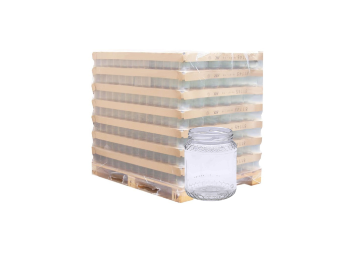 Palette de pots en verre 390 ml, modèle ITALVEOLE/MIELE, avec moulures en forme d’alvéoles. Ce design met en valeur les produits apicoles comme le miel, mais convient également à d’autres préparations alimentaires. Compatible avec capsules TO70. Pot esthétique, stable et facile à étiqueter. Palette de 2233 pots.