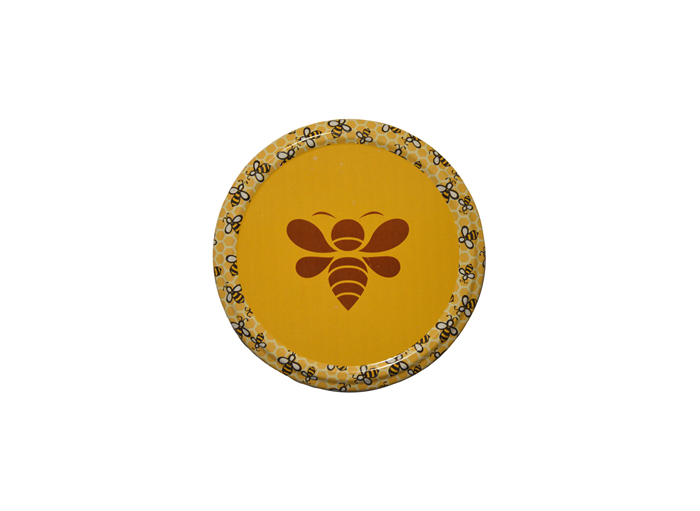 Capsule avec en son centre une silhouette d’abeille orangée sur fond jaune, cerclée de petites abeilles qui parsèment le contour de la capsule. Elle embellira votre pot de miel grâce à ses couleurs chaudes.