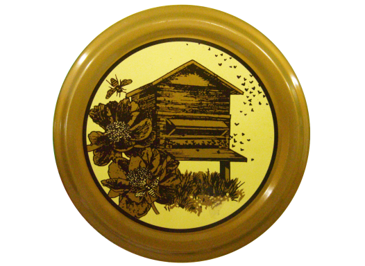 Capsules ruche chalet sur fond jaune, cerclées de doré, très élégantes pour vos pots de miel.