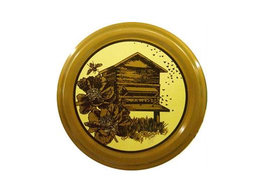 Capsules ruche chalet sur fond jaune, cerclées de doré, très élégantes pour vos pots de miel.