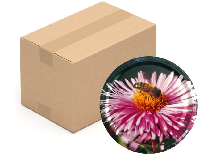 Capsules avec photo d’une abeille sur fleur rose. Son fond noir apporte une touche d’élégance et la couleur vive de la fleur attire le regard !