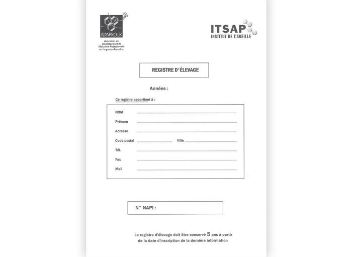 L'obligation de tenir un registre d'élevage découle de l'arrêté du 5 juin de 2000. Le nouvel environnement des exploitations (mise en application du règlement européen sur l'hygiène et la traçabilité, demandes de subventions FranceAgriMer, CAD, MAE...) rend son utilisation indispensable. ITSAP a conçu ce document pour qu'il puisse servir à l'apiculteur dans toutes les situations.