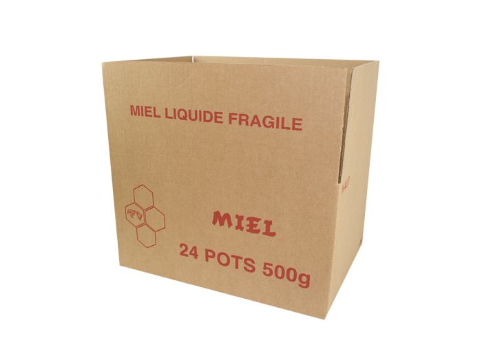 Ce carton d'emballage peut contenir 24 pots plastique de 500g. Les pots sont placés sur deux niveaux, séparés par une plaque de carton. Conversez et transportez facilement vos productions.