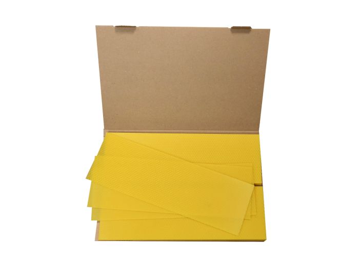 Carton de 1 kg de feuilles de cire gaufrées au format des cadres de hause Dadant. La feuille de cire gaufrée est constituée d'alvéoles obtenues par moulage en laminoir.