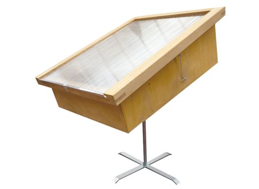 Le cérificateur solaire en bois vous permet de faire fondre la cire d'opercules, de cadres de corps ou de hausse, naturellement et sans la brûler. Il est muni de pieds en fer pour capter au mieux les rayons du soleil. En période de forte chaleur, la cire fond rapidement et vous pourrez non seulement récupérer la cire, mais également réutiliser des cadres filés en bon état.