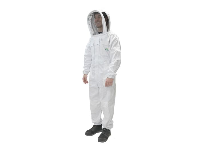 La combinaison Astro-Pro blanche vous assure une protection optimale pour vos visites au rucher. Son maillage serré en coton vous prémunit des piqûres d'abeille de la tête au pied. Votre lève-cadres ou tout autre matériel trouvera facilement sa place dans les longues poches de la combinaison. L'élastique au dos, aux pieds et aux manches de la combinaison ajuste la combinaison à votre taille et vous apporte du confort lors de vos manipulations. Le filet noir de votre voile Astronaute vous permet une excellente visibilité. La structure rigide du voile facilite les mouvements de votre tête, dans le but de ne jamais gêner votre vue. La visière peut s'ouvrir. Pensez à vous munir de gants.