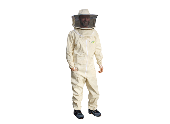Combinaison d'apiculture intégrale avec chapeau rond équipé d'un double arceau.