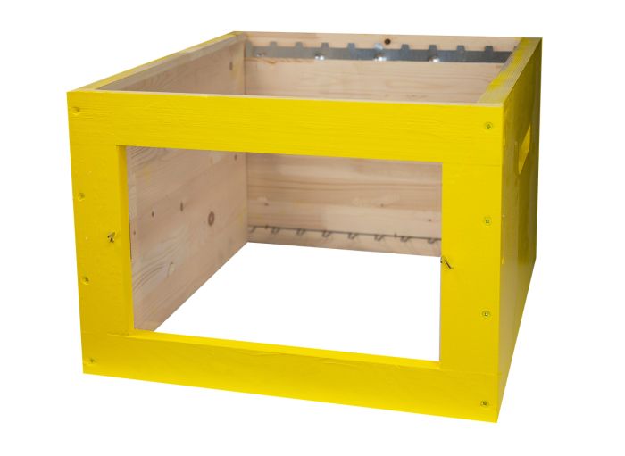 Corps équipé de crémaillères pour 10 cadres droits et de bandes intercadres. En épicéa, assemblage mi-bois.