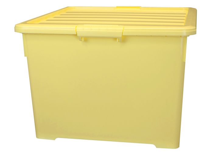 Caisse sur roulettes encastrées, empilable, et dotée de poignées bloquantes.
