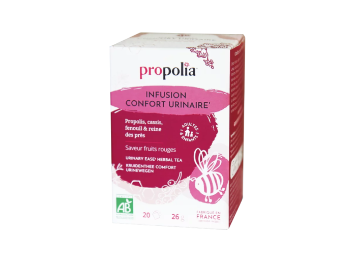 Infusion BIO douce et efficace pour le bien être urinaire, alliant les bienfaits de la propolis à ceux des plantes traditionnellement reconnues : cassis, fenouil et reine des prés. Peut-être administré sous forme de cure ou en soutien ponctuel.