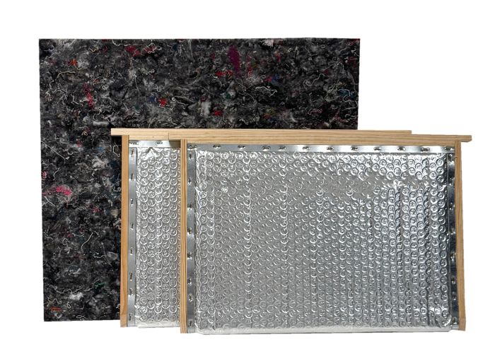 Pack d'isolation pour ruche, composé de 2 partitions isolantes double bulle et d'un coussin isolant en fibres. Conçu pour limiter les pertes de chaleur et protéger la colonie des variations thermique. Idéal pour améliorer le confort des abeilles.