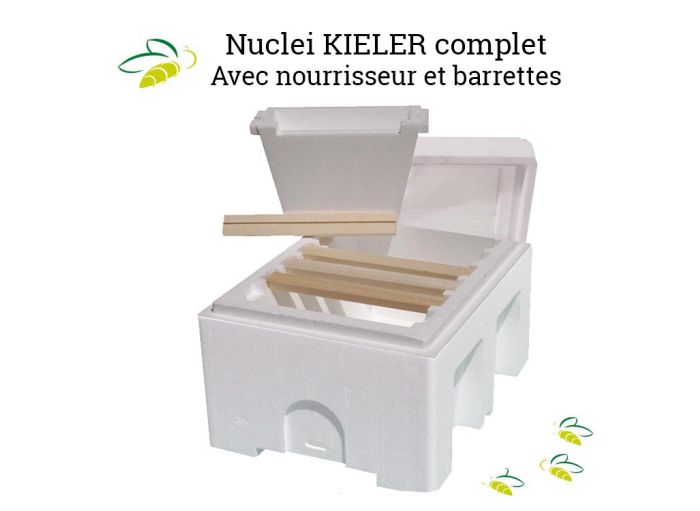 Le pack nucléi de fécondation KIELER est indispensable pour obtenir des reines fécondées. Le KIELER est un nucléus en polystyrène contenant six cadrons disposés en bâtisse chaude. Les cadrons sont munis d’amorces de cire permettant aux abeilles d’adapter librement leur construction à la forme trapézoïdale de la ruche.