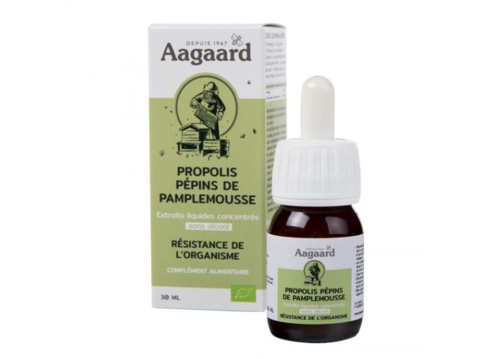 Les gouttes Propolis et extrait de pépins de Pamplemousse AAGAARD, sans alcool, sont un complément alimentaire issu de l’apiculture biologique.