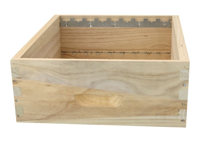 Hausse de ruche Dadant 10en paulownia Greenbee, assemblage à tenons, pour 9 cadres droits. Hausse légère et résistante, équipée de crémaillères pour cadres droits et de bandes d'intercadres. Disponible également pour 8 cadres droits ou en bandes lisses pour cadres hoffmann.