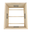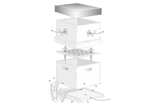 La hausse de ventilation laisse s’échapper l’air juste sous le toit, évitant les montées en température lors des fortes chaleurs et la stagnation d’humidité au sein de la ruche. Une plinthe en partie basse assure son positionnement et l’étanchéité.