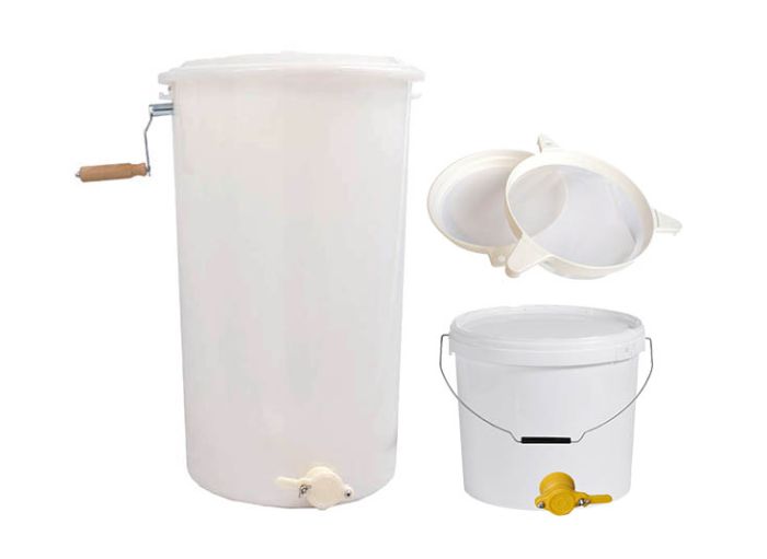 Extracteur à miel manuel 2 cadres, passoire double filtre et seau maturateur pour 20kg de miel.