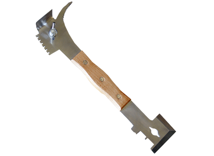 L'autre embout possède un arrache-clou, ce qui vient compléter le rôle de marteau du lève-cadres. Sur la tranche, le métal épouse parfaitement la tête de vos cadres, vous pouvez ainsi nettoyer efficacement ses rainures. Sur l'autre versant, le racloir vous débarrassera de la cire et la propolis accumulées sur les autres parties de vos cadres et de votre ruche. Le manche en bois cambré vous offre une confortable et bonne prise en main.