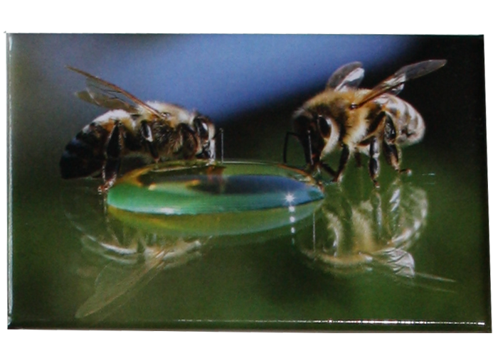 Les magnets sont idéaux pour accrocher votre liste de courses sur un tableau aimanté, le frigo de votre cuisine ou de votre miellerie. Le plus : la photo de deux abeilles étanchant leur soif apporte une touche déco poétique. Cette dernière, imprimée en haute qualité sur une coque métallique est glacée par un film plastique brillant.