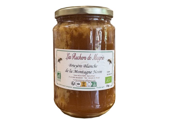 Ce miel de bruyère blanche, récolté dans les zones sauvages et préservées de la Montagne Noire, est un miel de caractère. Sa texture dense et crémeuse, sa robe ambrée à foncée et ses arômes puissants, boisés et légèrement amers en font un produit très apprécié des connaisseurs.