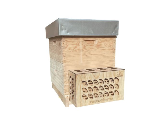 Cette muselière en bois constitue une extension naturelle de la ruche. Facile à installer, elle permet de réduire le stress des abeilles lorsqu’elles subissent les attaques de leurs différents prédateurs.