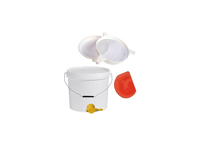 Pack maturateur 20Kg pour la miellerie amateur, avec un maturateur en plastique de 20kg, une raclette corne souple (la couleur peut varier selon les arrivages), et une passoire nylon double filtre.