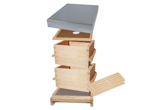 Pack ruche Warré commplet , comprenant un plancher totalement ventilé, deux corps Warré, un nourrisseur couvre-cadres et un toit tôle. Prêt à l'emploi cette ruche complète assure une apiculture naturelle grâce à sa gestion naturelle.
