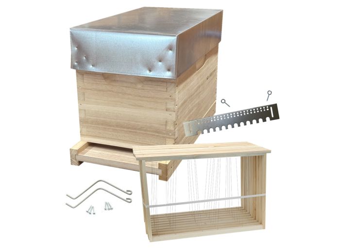 Cette ruchette est vendue en pack avec la quincaillerie (entrée métallique, fixe-éléments et pitons) ainsi que 6 cadres de corps Dadant droits.