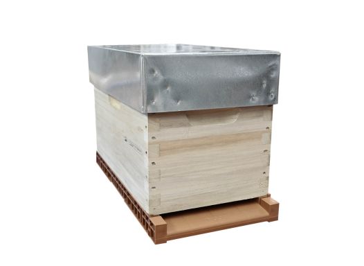 Ruchette en paulownia au format Dadant 6, composée d'un corps à crémaillères pour 6 cadres droits, d'un plancher Dadant 6 plastique Nicotplast à ventilation totale, et d'un toit en tôle galva premium de hauteur 105mm.