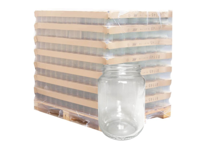 Palette de pots en verre 385 ml, format standard, compatible avec capsules TO63. Sa forme droite facilite l’étiquetage et le capsulage. Pot stable, empilable et adapté à un usage professionnel ou artisanal, palette de 2097 pots.