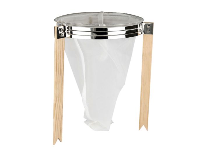 La passoire est équipée d'un support en bois sur lequel est monté un cerclage en acier (diamètre cerclage 32cm). Elle vous garantie un filtrage impeccable, une première passoire à mailles fines qui filtre les plus grosses impuretés, la seconde (cône) filtre grâce à une maille extra-fine les plus petites particules. Elle peut se poser sur un maturateur ou sur seau.