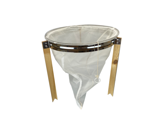 Cette passoire conique double filtre est l'outil idéal pour un filtrage précis et efficace de votre miel. Conçue avec un trépied en bois et un cerclage en acier de 45cm de diamètre, elle allie solidité et stabilité. Son système à double filtration garantit un résultat impeccable : une première passoire à mailles fines retient les plus grosses impuretés, un second filtre conique, à maille extra-fine, caputre les plus petites particules.