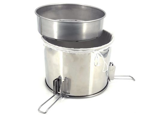 Ce tamis comprend 3 parties : un filtre dégrossisseur en acier inox, un sac filtrant en toile de nylon de 275 microns et un structure porteuse de 470 mm de diamètre à pieds fixes. Sa grille et sa toile vous garantissent un filtrage parfait de votre miel.