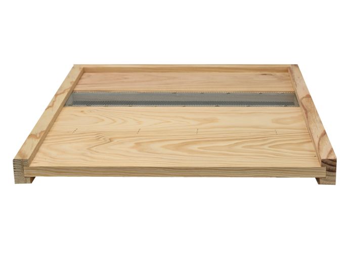 Plancher en pin maritime pour ruche Dadant 12. Réversible, équipé d'une ventilation arrière en grillage galva ce qui contribue à améliorer l'atmosphère dans la ruche.