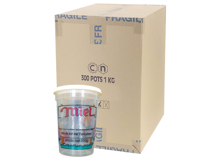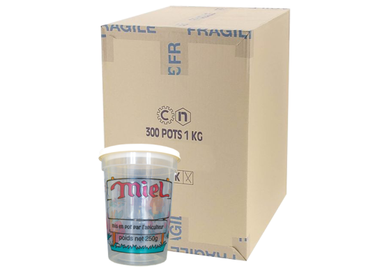 Informations : Contenance : 190 ml = env. 250 g de miel. Conditionnement : le carton de 300 Diamètre pot : 71 mm Hauteur : 91 mm Cartons cloisonnés de 300 pots, avec 300 couvercles en piles de 25 séparées par un intercalaire.