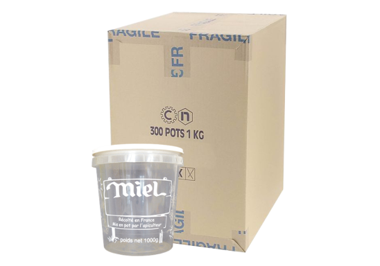 Informations : Contenance : 750 ml = env.1 kg de miel. Conditionnement : le carton de 300 Diamètre pot : 115 mm Hauteur : 117 mm Cartons cloisonnés de 300 pots, avec 300 couvercles en piles de 25 séparées par un intercalaire.