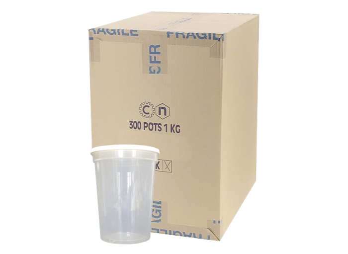 Pots et couvercles en polypropylène injecté, matière plastique alimentaire* recyclable conforme à la directive 2002/72/EC régissant le contact alimentaire et à la directive 94/62/EC régissant les emballages et déchets d'emballages. Absence de Bisphénol A et Phtalates.