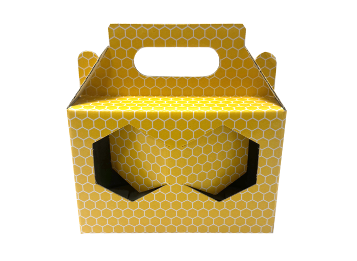 Présentoir en carton pour 2 pots de 228 ml, idéal pour mettre en valeur votre miel ou autres produits artisanaux. Fabriqué en carton rigide, sa couleur jaune et ses motifs représentant des alvéoles offrent une présentation de vos pots attractive. Parfait pour attirer l'attention en boutique ou sur les marchés.