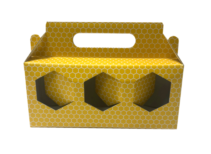 Présentoir en carton alvéolé pour 3 pots de 228ml, idéal pour mettre en valeur vos pots de miel ou autres spécialités gourmandes. Fabriqué en carton rigide et composé de jolis motifs, il se monte facilement pour une présentation esthétique en boutique, sur les marchés ou pour des cadeaux gourmands !