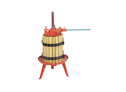 <p style="text-align: left;"><strong>Pressoir avec mécanisme à cliquets</strong> augmentant la force de pression. Vis centrale en acier, maie (bassin) en acier avec renforcements radiaux, fermeture de la claie avec goujons extractibles, claie (cage) en bois de hêtre, sellettes de pressage en hêtre sec, mouvement mécanique en fonte.</p>